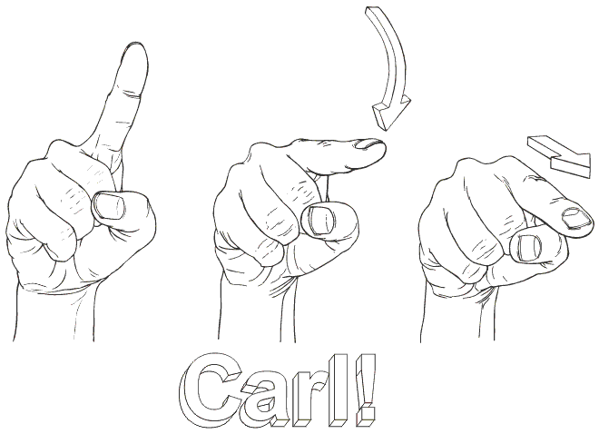 Written The non-verbal gesture accompanying "Carl!" is that of an index finger extended, followed by a vertical slash downwards, followed by a 'poke', signifying the drawing of an exclamation mark in the air.